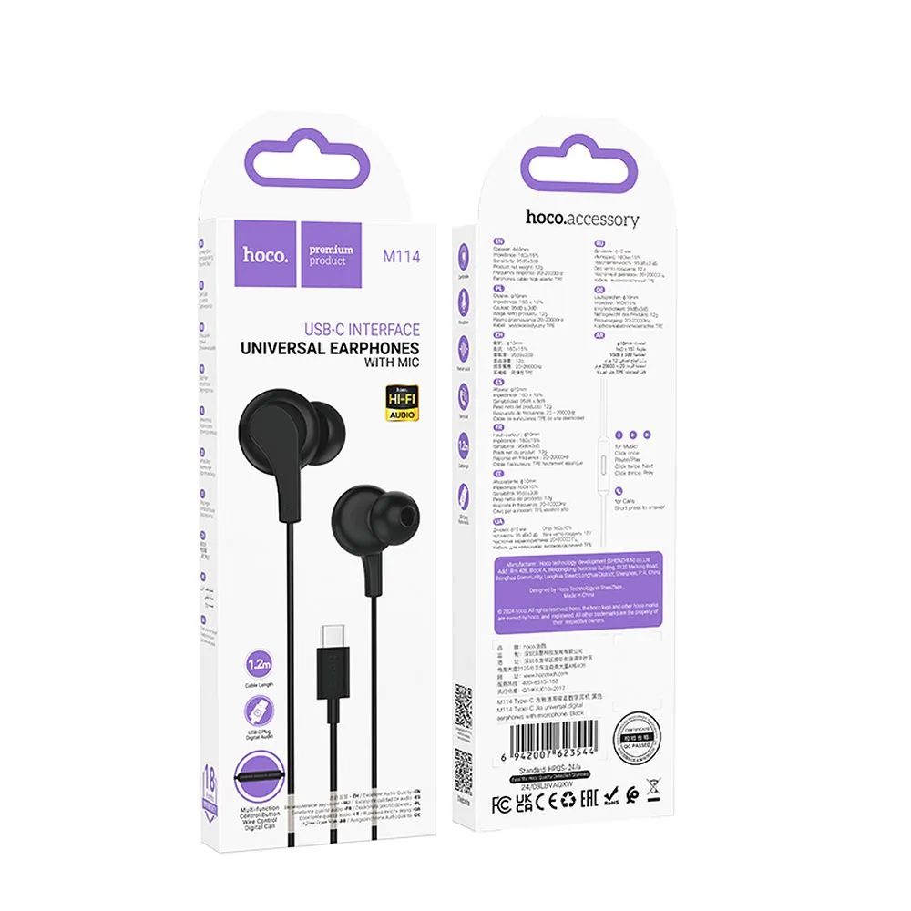 Hoco M114 USB-C са универсални жични слушалки, подходящи за ежедневна употреба.