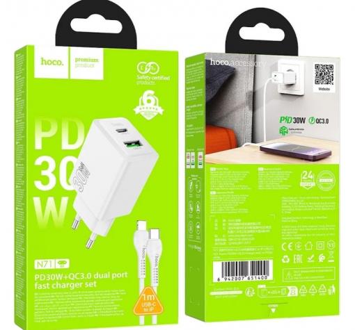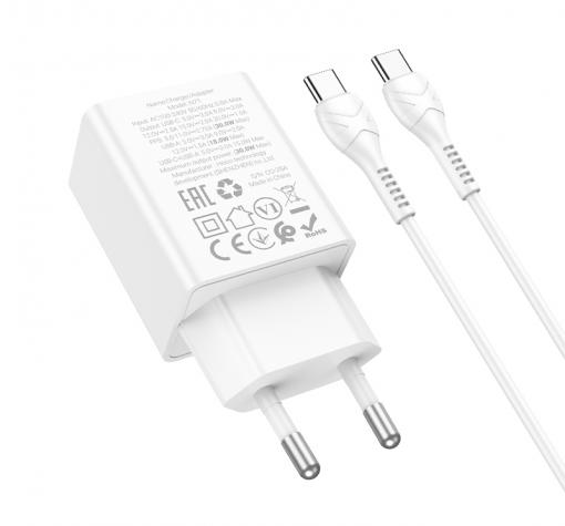 Зарядно устройство HOCO N71 220V 30W / 2 port USB / кабел Type C-Type C - бял