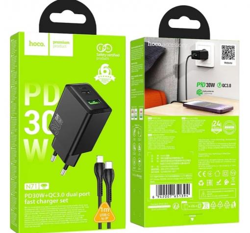 Зарядно устройство HOCO N71 220V 30W / 2 port USB / кабел Type C-Type C - черен