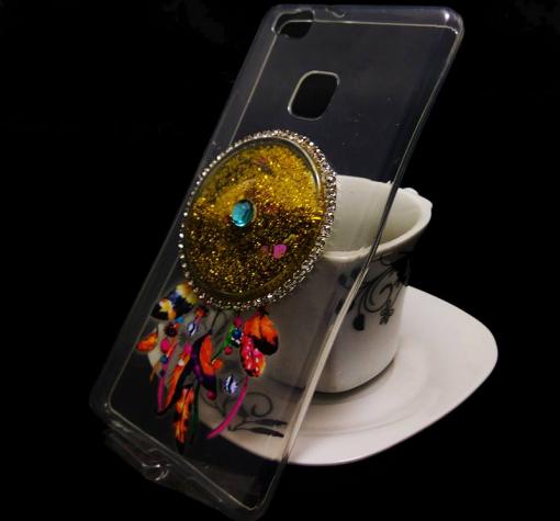 Луксозен силиконов калъф / гръб / TPU 3D за Huawei P9 Lite - прозрачен / жълт брокат / капан за сънища