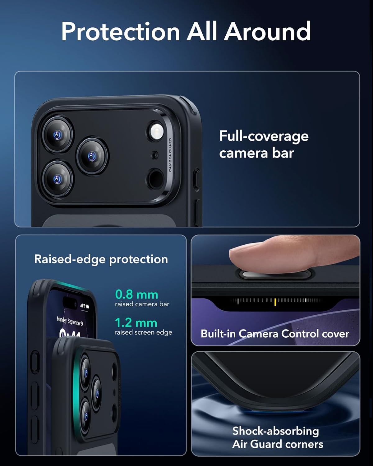 - Защита от падане от военен клас: стриктно тествана, за да се гарантира пълна защита от всички страни, със специално проектирани ъгли Air Guard, които абсорбират удара.