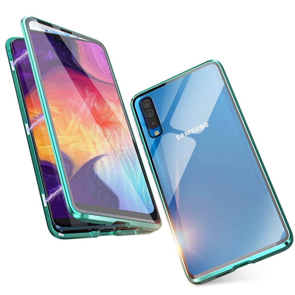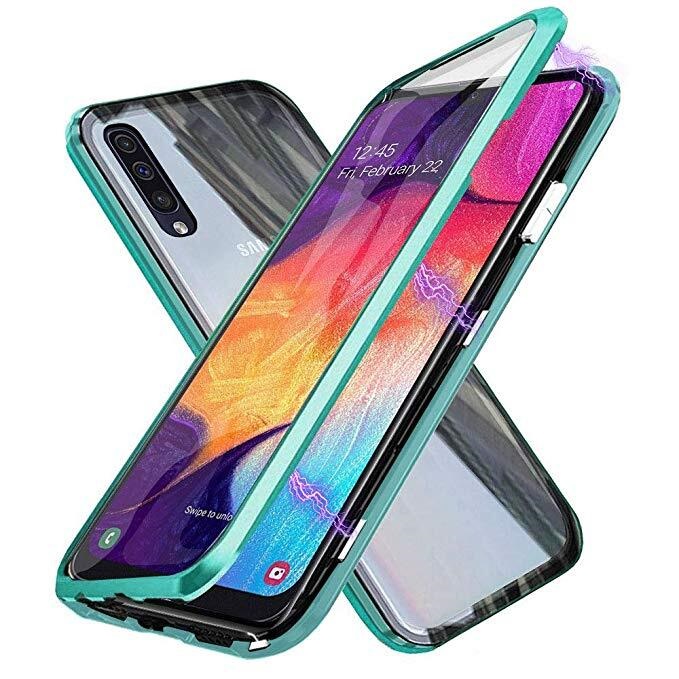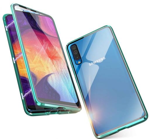 Магнитен калъф Bumper Case 360° FULL за Samsung Galaxy A70 - прозрачен / зелена рамка