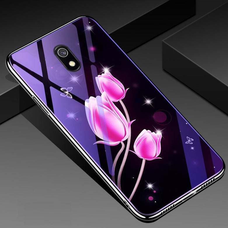 Луксозен стъклен твърд гръб със силиконов кант за Xioami Redmi 8A - розови лалета