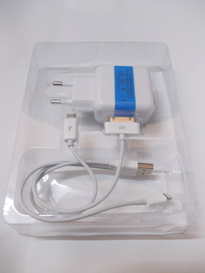 Универсално зарядно устройство 220V с два USB порта 3 в 1 за Apple iPhone / Apple iPad / Samsung Galaxy Tab / Samsung - бял