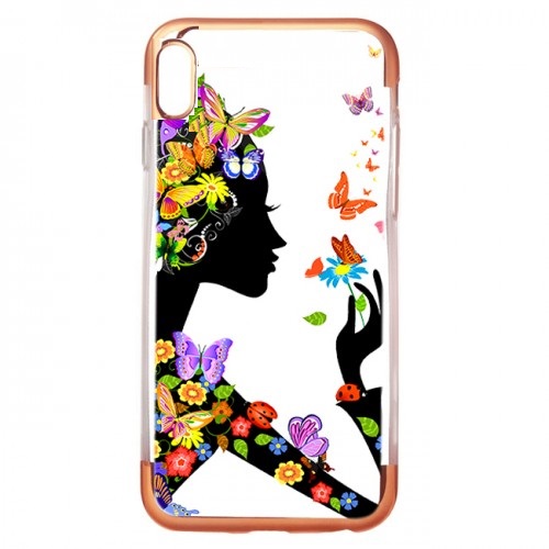 Силиконов калъф / гръб / TPU за Apple iPhone X / iPhone XS - момиче с пеперуди / Rose Gold кант