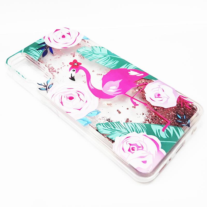 Луксозен твърд гръб 3D Water Case за Samsung Galaxy A7 2018 A750F - прозрачен / розов брокат / фламинго