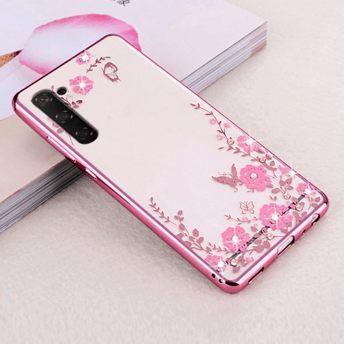 Луксозен силиконов калъф / гръб / TPU с камъни за Samsung Galaxy Note 10 Plus N975 - прозрачен / розови цветя / Rose Gold кант